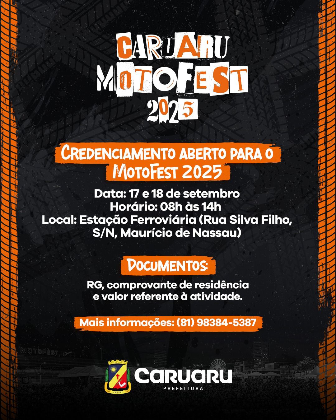 A Prefeitura de Caruaru, por meio da Secretaria da Fazenda (SEFAZ), realizará o credenciamento de comerciantes para o Motofest Caruaru 2025 nestas quarta (17) e quinta-feira (18), na Estação Ferroviária, das 08h às 14h.