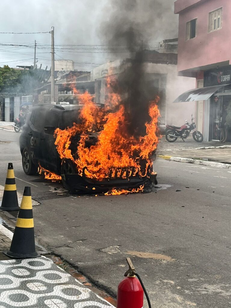 Carro da Guarda Municipal pega fogo e fica destruído no centro de Brejo da Madre de Deus; VEJA VÍDEO