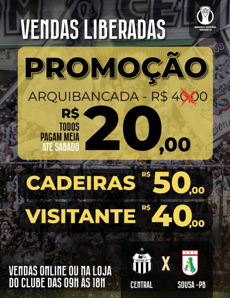 O Central Sport Club liberou a venda de ingressos para o confronto diante do Sousa-PB, válido pela 3ª rodada do Campeonato Brasileiro da Série D. A partida marca um momento especial para a torcida alvinegra, será o primeiro jogo com presença de público desde o dia 24 de agosto de 2025. Para celebrar o […]